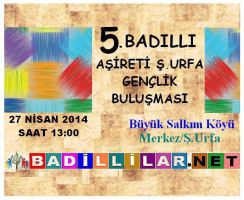 20 NİSANDA YAPILMASI PLANLANAN 5.BADILLI AŞİRETİ ŞANLIURFA GENÇLİK BULUŞMALARI SINAVLAR NEDENİYLE BİR HAFTA İLERİYE ALINMIŞTIR (27 NİSAN 2014 PAZAR GÜNÜ SAAT 13:00' DA BÜYÜK SALKIM KÖYÜNDE BULUŞMA GERÇEKLEŞTİRİLECEKTİR.) |