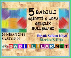 Badıllı Aşireti Şanlıurfa Gençlik Buluşmalarının 5.si Şanlıurfa Merkeze Bağlı Büyük Salkım Köyünde yapılacak.20 Nisan pazar günü Saat 13.00 da. |