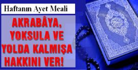 Haftanın Ayet Meali![]() Bismillahirrahmanirrahim Cenab-ı Hak (c.c), Rum Suresi 36-38. ayetlerinde mealen şöyle buyuruyor: 36-Hâlbuki insanlara bir rahmet (ni‘met) tattırdığımız zaman, onunla sevinirler. Fakat ellerinin takdîm ettiği şeyler (işlediği günahlar) yüzünden başlarına bir kötülük isâbet etse, onlar hemen ümidsizliğe düşerler! 37-Görmediler mi ki şübhesiz Allah, rızkı dilediğine genişletiyor ve (dilediğine de) daraltıyor. Şübhe yok ki bunda, îmân edecek bir kavim için elbette ibretler vardır. 38-Öyle ise akrabâya, yoksula ve yolda kalmışa hakkını ver! Allah’ın rızâsını isteyenler için bu pek hayırlıdır. İşte onlar, gerçekten kurtuluşa erenlerdir. |