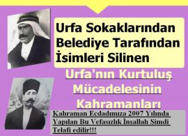 Hamidiye mahallesinde 2007'de degiştirilen sokak isimleri arasında Urfa'nın kurtuluş Mücadelesinin önemli isimlerinden Badıllı Said Bey,İzollu Bozan Bey isimlerini taşıyan sokak isimleride degiştirildi. Şanlıurfa Belediyesi tarafından 2007 yılında adrese dayalı nufus kayıt sistemi bahane edilerek eski sokak isimleri yerine yeni soskak isimleri verildi.Bu sokaklar arasında Hamidiye mahallesinde yer alan Badıllı Sait Bey,İzollu Bozan Bey gibi Urfanın Kurtuluş Destanını yazan isimlerde degiştirildi.Bir tarafta Şanlıurfa Belediyesi bu gibi Urfaya mal olmuş isimleri urfa sosoklarından silerken,diğer taraftan kültürel degerleri koruma adına eski urfa denilen bölgedeki 12 mahallenin eski sokak isimlerini yaşatılmaya çalışılmakta.Eger o isimler Urfa için değer kabul ediliyorsa,Urfa Mücadelesinin kahramanlarınında bir degeri olmalıdır.İnşallah yeni belediye başkanı ve belediye yetkilileri bu konuya el atar ve ecdadımıza yapılan bu saygısızlık,tekrar yeni başka sokak ve caddelere ecdadımızın isimleri verilerek düzeltilir. |