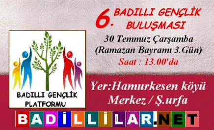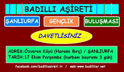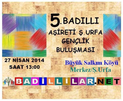 4.Gençlik Buluşması :Badıllı Aşireti Şanlıurfa gençlik paltformu tarafından 4. sü düzenlenen buluşma Karaköprü Badıllıları ev sahipliğinde Karaköprü Belediyesi Kültür merkezinde yapıldı.Diğer buluşmalardan farklı olarak İstanbul'dan gelen Erzurum Horasan'daki Badıllı Gençleri de bu buluşmaya katıldır.Tüm Badıllı Aşireti Urfa Köylerinden katılımın olduğu buluşma çok samimi bir hava içinde geçti.Badıllıların birlik ve beraberligi adına büyük adım olmuştur.5.Buluşmanın 20 Nisanda (sınavlar nedeniyle 27 Nisan Tarihine Alınmıştır) Şanlıurfa Merkeze Bağlı Büyük Salkım Köyünde yapılması kararlaştırılmıştır.Bu buluşmaya büyük mesafeler katederek katılım sağlayan erzurum Horasan badıllı gençlerine sonsuz teşekkür ederiz.(Karaköprü Buluşmaları Fotoğraflar)